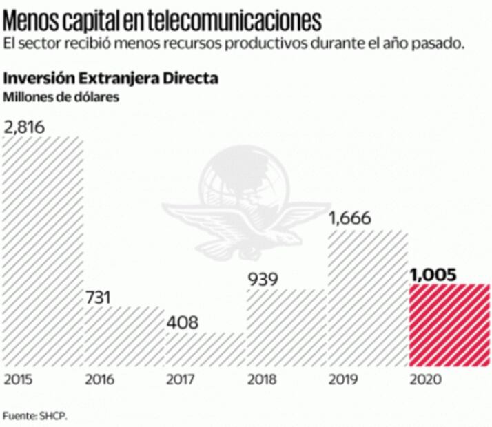 La inversión extranjera directa (IED) en telecomunicaciones cayó de mil 665.8 millones de dólares en 2019, a mil 5.1 millones de dólares el año pasado, de acuerdo con cifras de la Secretaría de Economía, lo que significa una disminución de 39.7%.