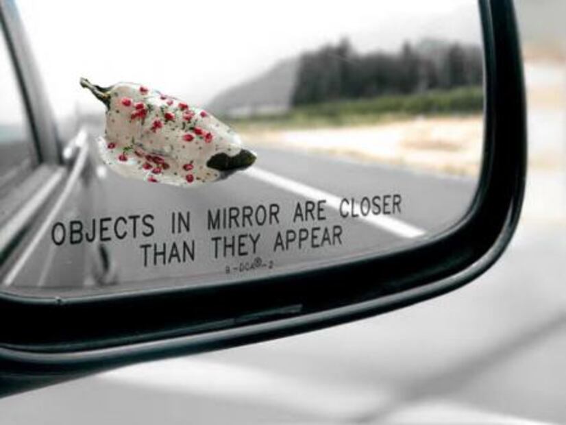 El meme más popular fue uno de un chile en nogada visto en un espejo retrovisor, en el que “los objetos están más cerca de lo que parecen”.