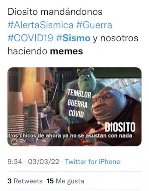 “Diosito mandándonos Alerta Sísmica, Covid-19, Guerra y nosotros haciendo memes”, se lee en otro meme donde los personajes de la película Monster Inc. añaden “los chicos de ahora ya no se asustan con nada”.